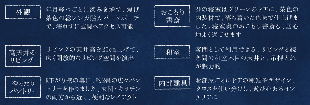 年月とともに風合いを増す総レンガ貼りの外観。20cm高めた天井が開放感を生むリビングや、秘密基地のような「おこもり書斎」など、細部にまでこだわりと遊び心を詰め込みました。機能性とデザインが共演する、暮らしを楽しむ住まいです。
