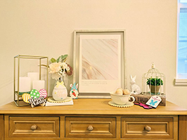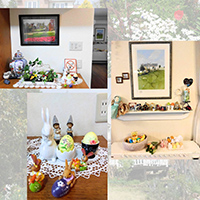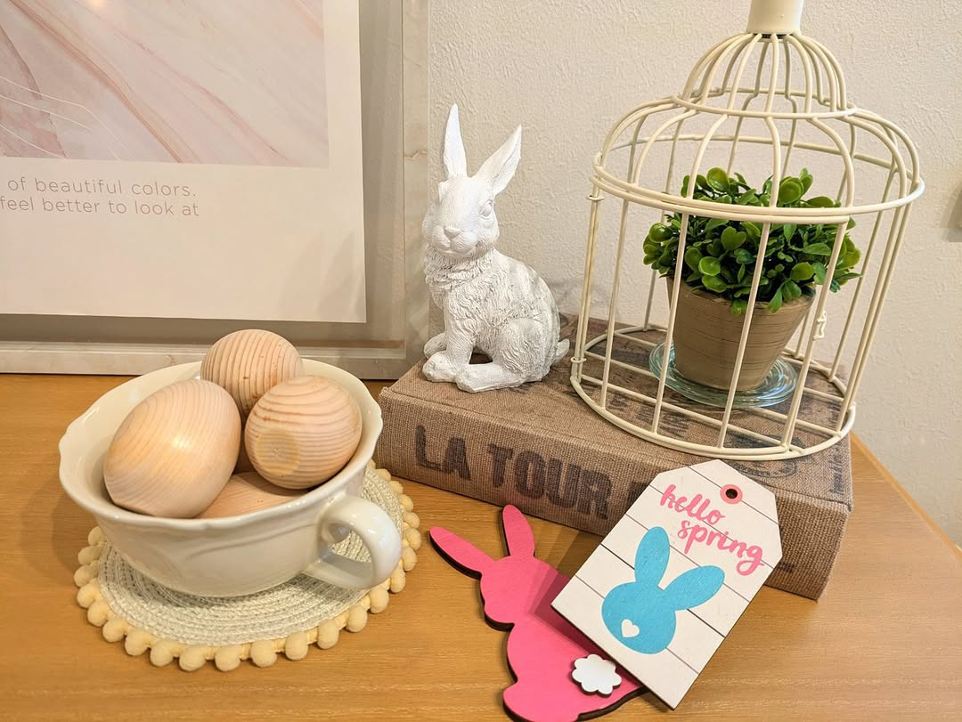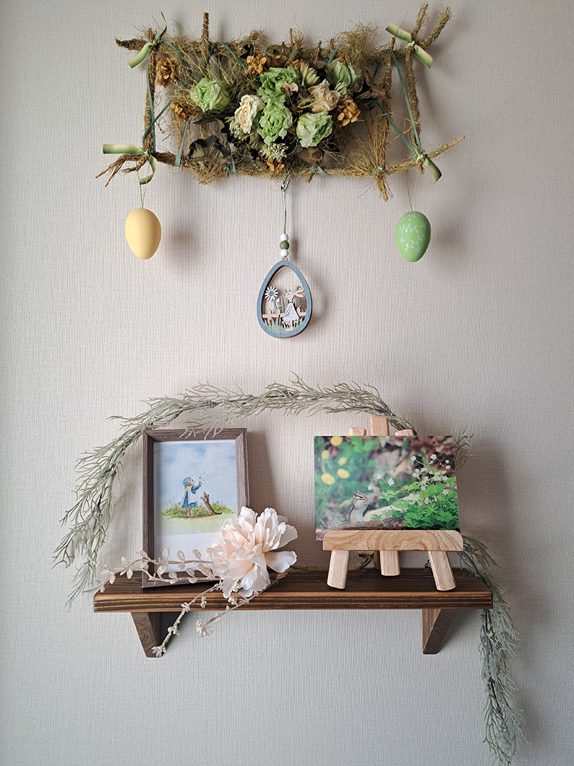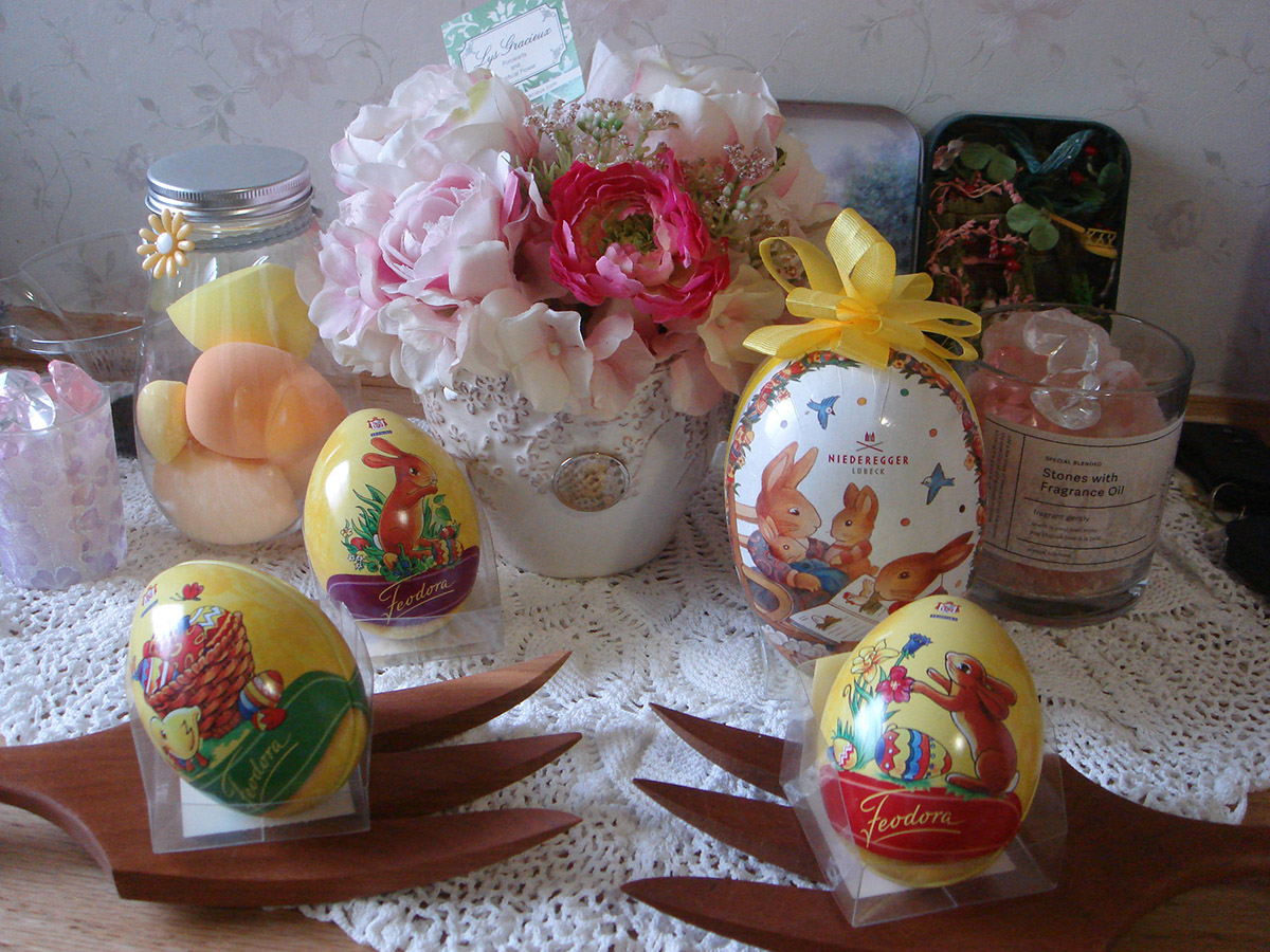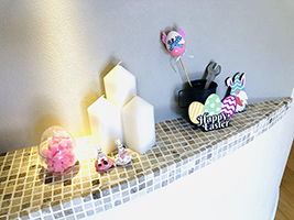 玄関カウンターやリビングの飾り棚や役目を終えた畜暖の上も、イースターグッズで溢れます。