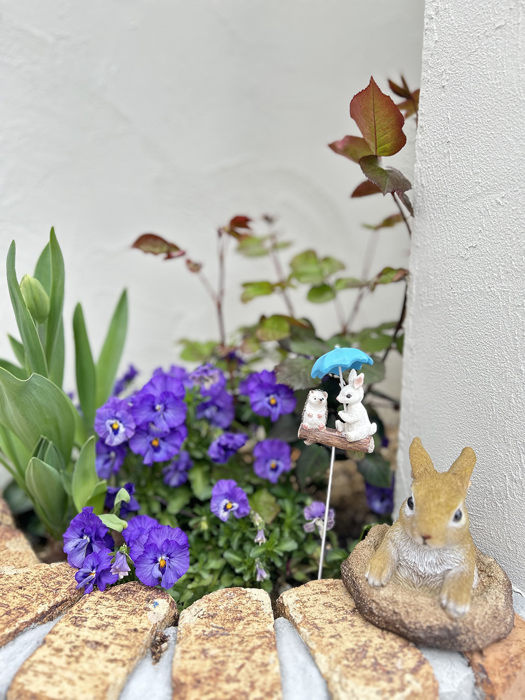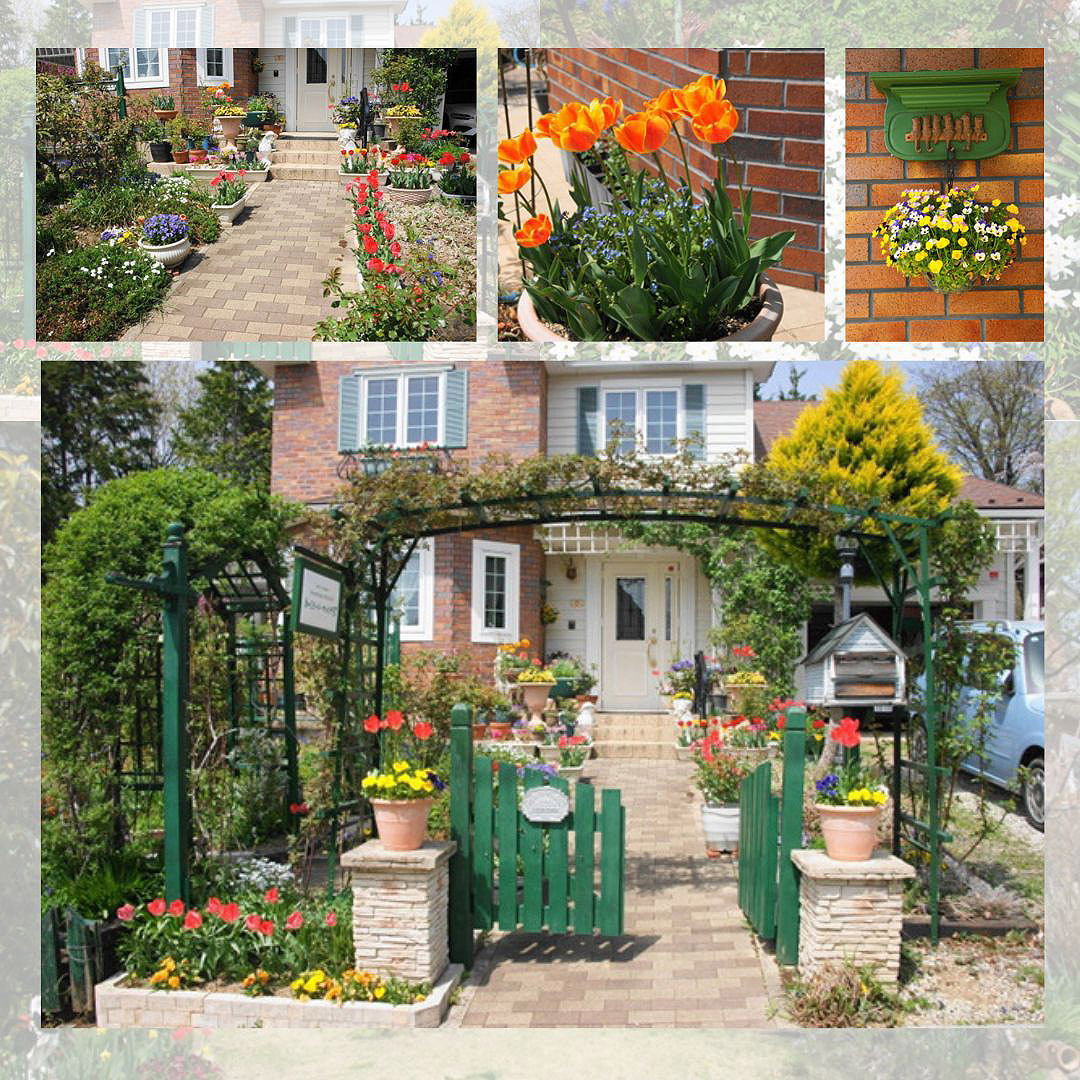 花、花、花に囲まれた玄関周り。チューリップ、イベリス、ビオラ、パンジーが咲き競っています。