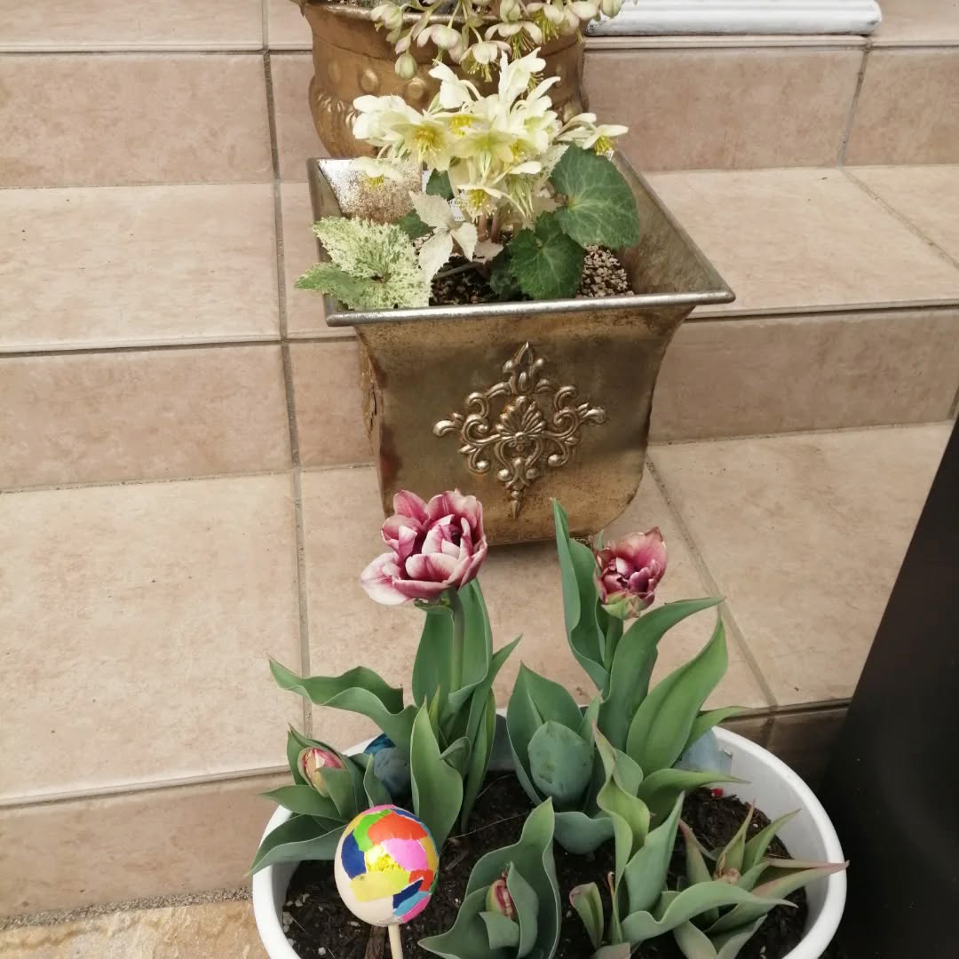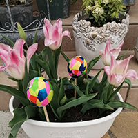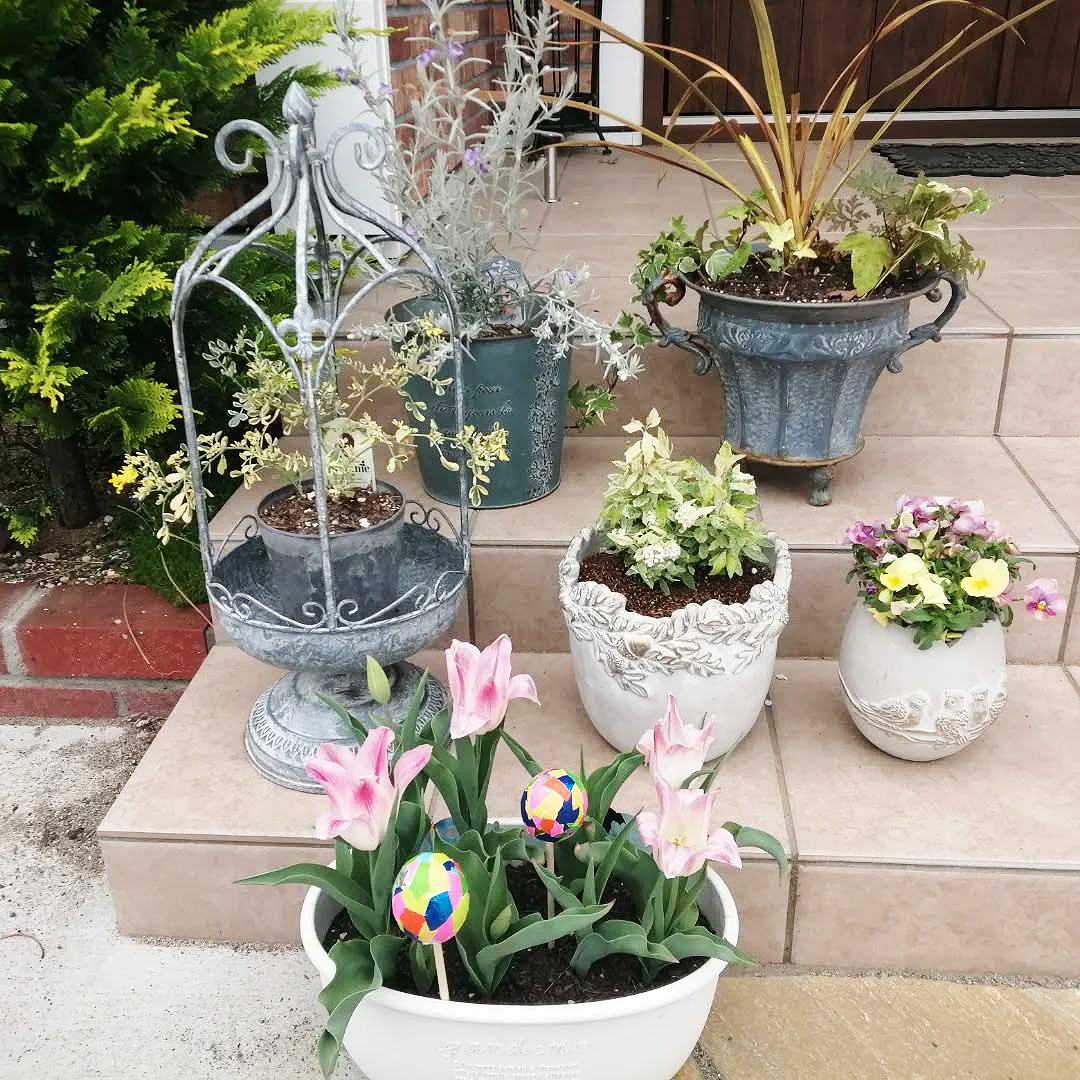 チューリップのプランターに挿したエッグのピックは息子と作りました。