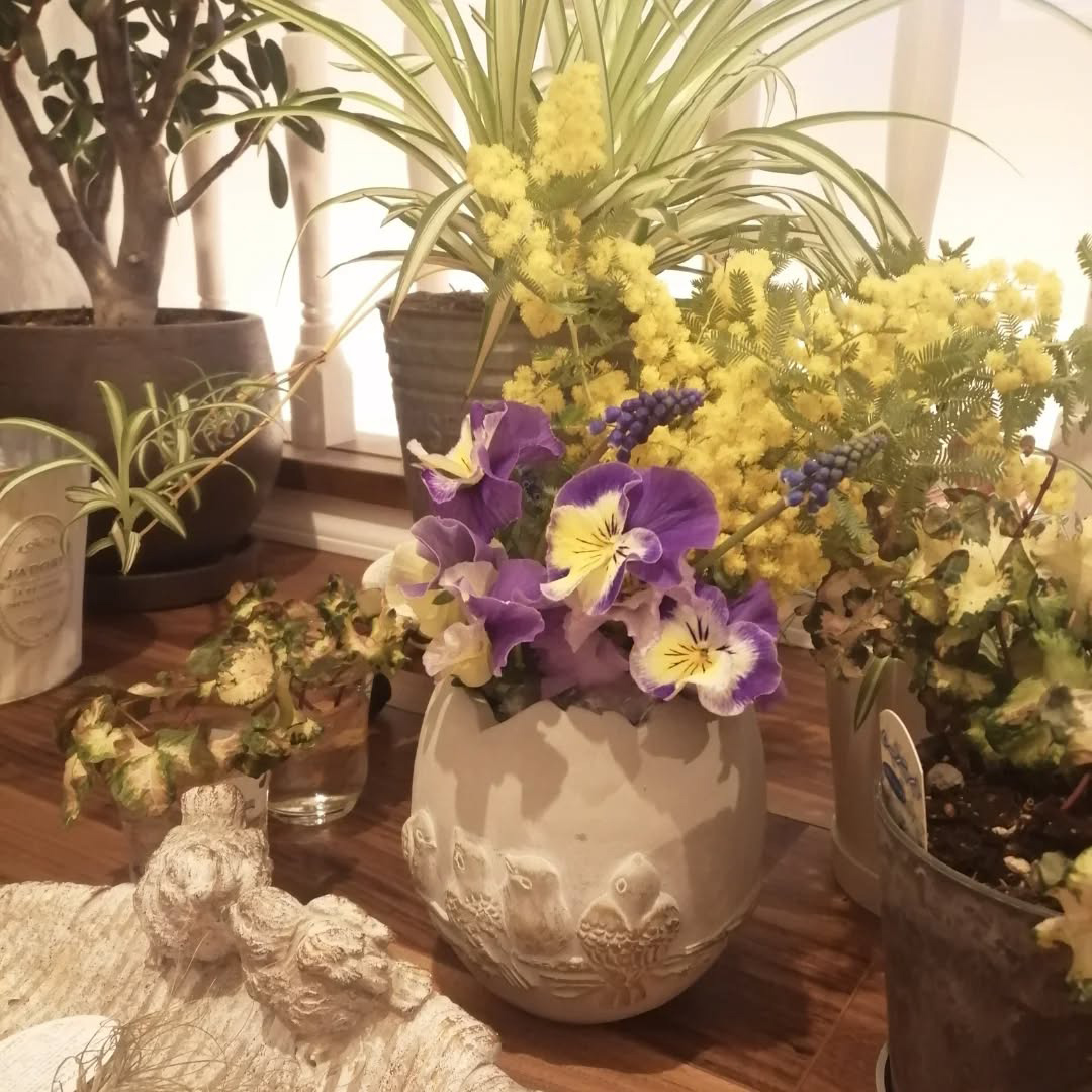 鳥がモチーフの卵型の植木鉢は、何を植えても可愛いです。