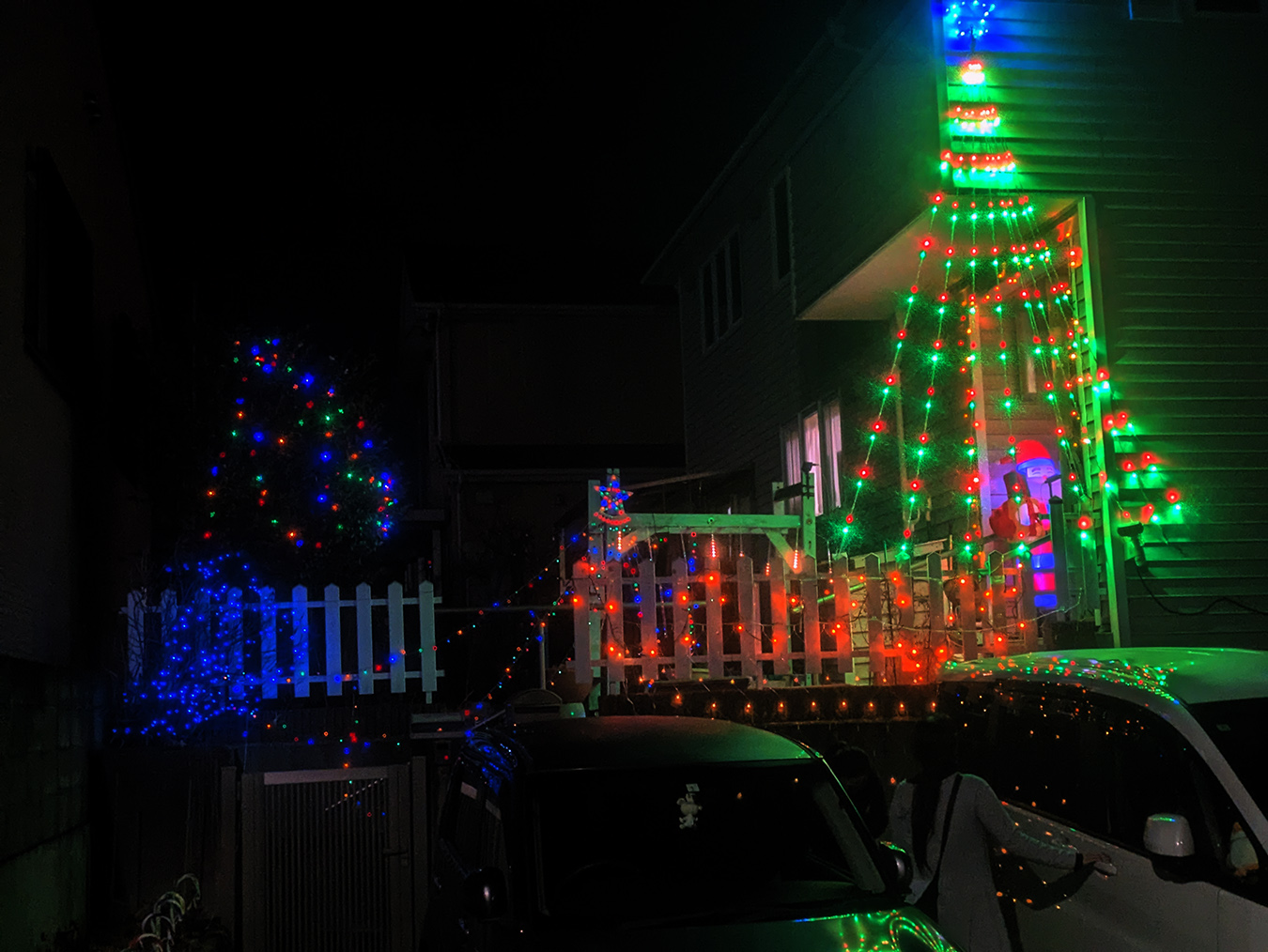夕暮れが迫るとクリスマスイルミネーションが瞬き始めます。